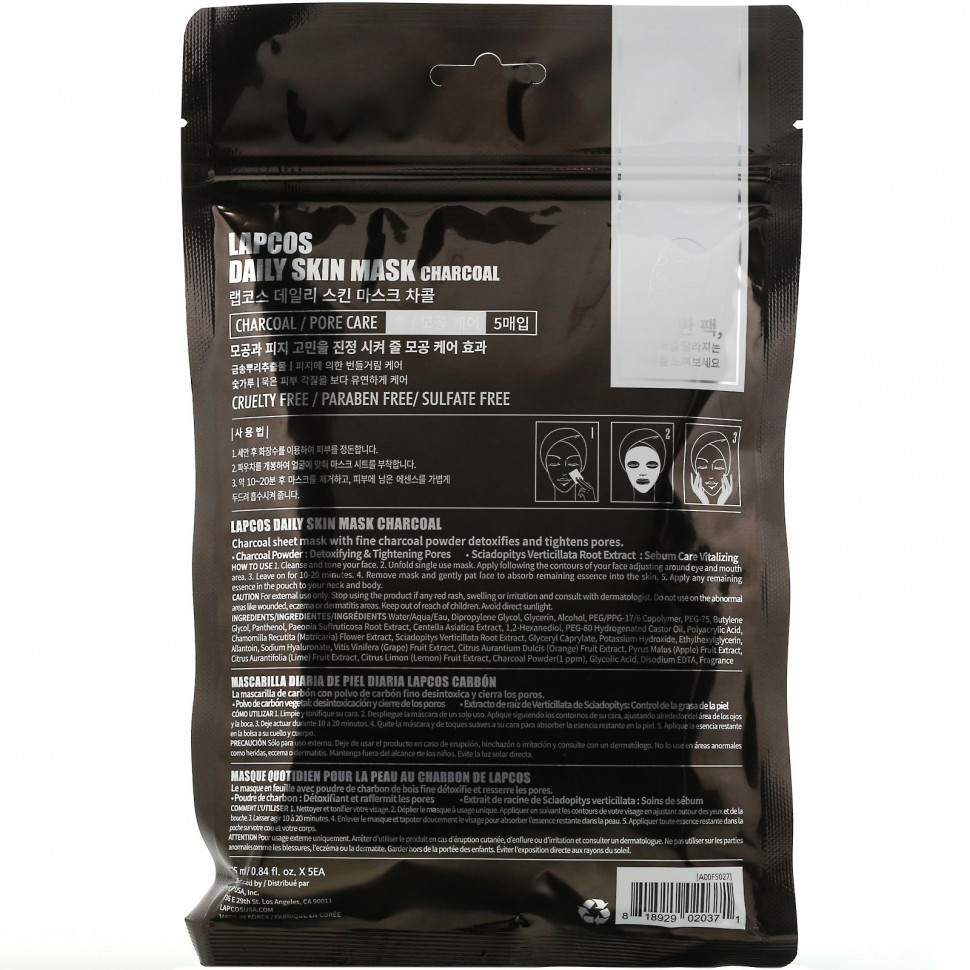 Угольная тканевая маска с мелким порошком из древесного угля выводит из кожи токсины и сужает поры.