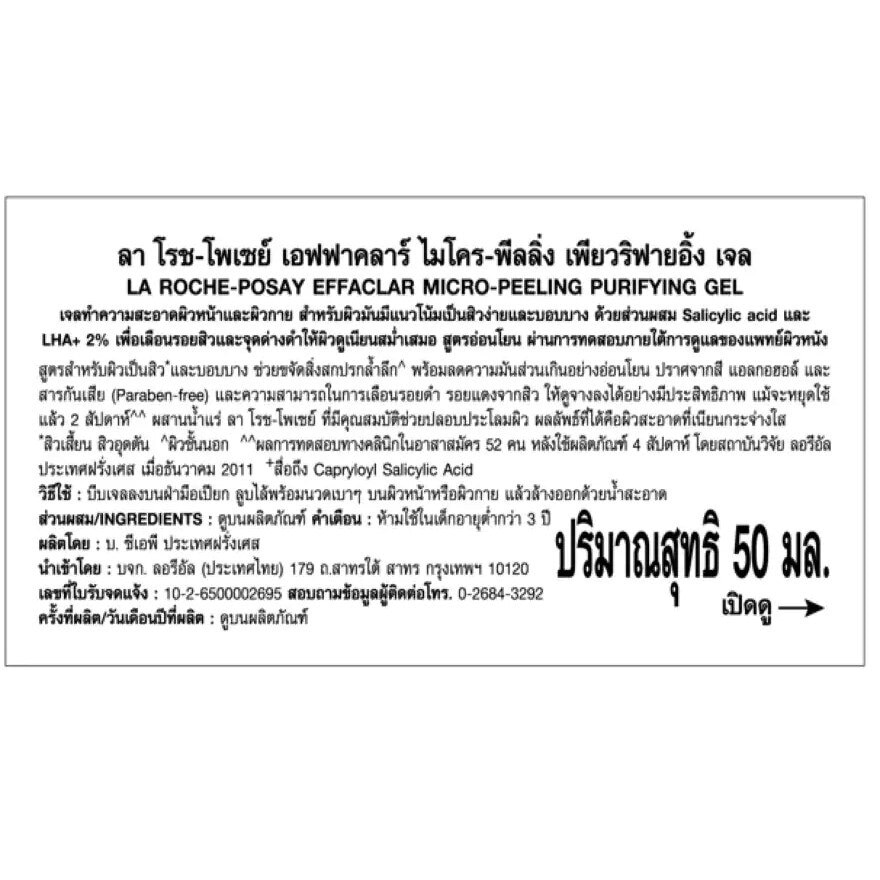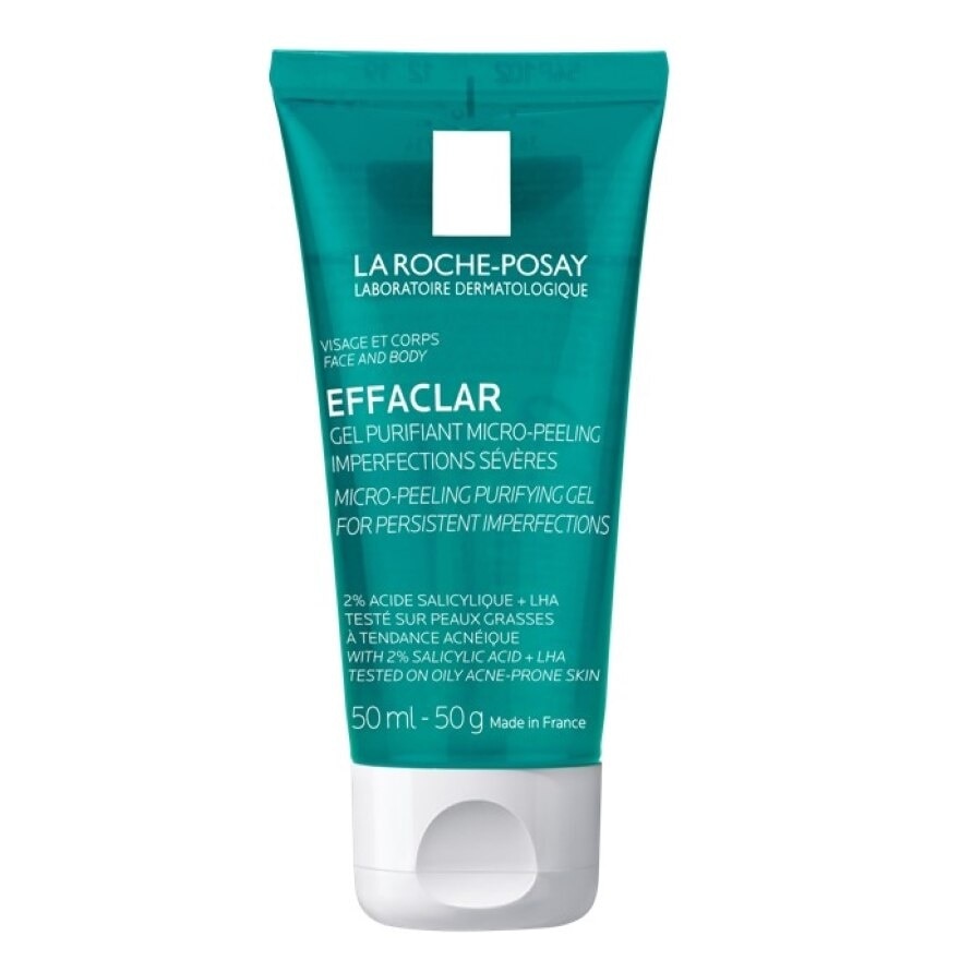 Laroche Posay EFFACLAR Micro-peeling gel intensely purifies oily skin, deeply unclogs pores, and removes excess sebum. It helps reducing progressivFavorizing the elimination of dead cells without irritation, EFFACLAR Micro-peeling gel helps removing impurities and excess sebum and deeply unclogs pores. It reduces the visibility of blackheads and controls shine. Leaves skin soft, clean and refreshed.ely and durably persistent imperfections including marks, and preventing recurrence.The first La Roche-Posay cleanser formulated with micro-exfoliating and purifying agents. Acts on persistent imperfections and sebum while bringing a maximum of comfort to acne-prone skin, even on body. Formula tested under dermatological control. Hypoallergenic. Physiological pH. Tested on oily acne-prone skin. Allergy-tested.