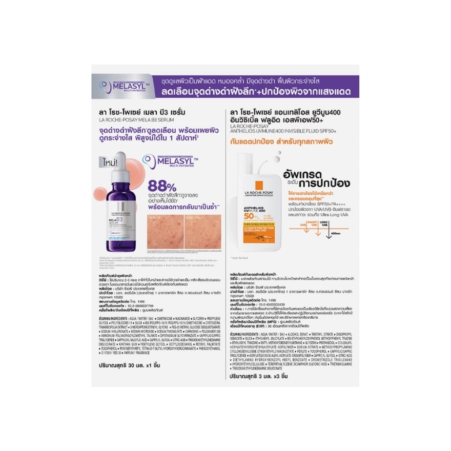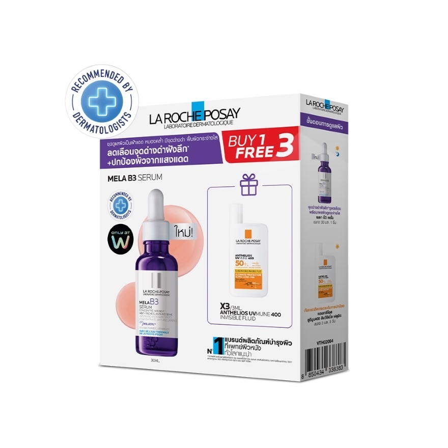 Laroche Posay Set Mela Serum.Value set of La Roche Posay MELA B3 SERUM The dark spots serum that will reduce the skin discoloration, including sunspots, age spots, post acne marks and even the most persistent dark spots with Anthelios Invisible Fluid, Sunscreen with high and broad protection efficacy with Mexoryl400.