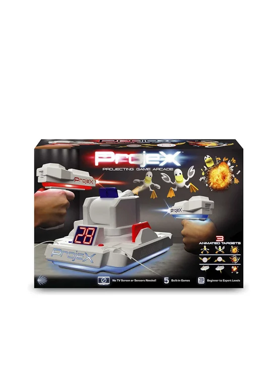 When it’s lights off, it’s game on with the ProjeX Animated Projecting Game Arcade from the brand LASER X. No TV, screens of sensors are necessary. Just point ProjeX at a blank wall, grab the blaster, aim, and blast the targets! Three interchangeable animated target image slides let you project ducks, targets or UFOs – each with its own unique sound effects and movements! There are five different built-in games and 3 skill levels from beginner to advanced and expert. Play solo, head-to-head or in “Co-Op Mode,” where two players team up to get the highest combined score.