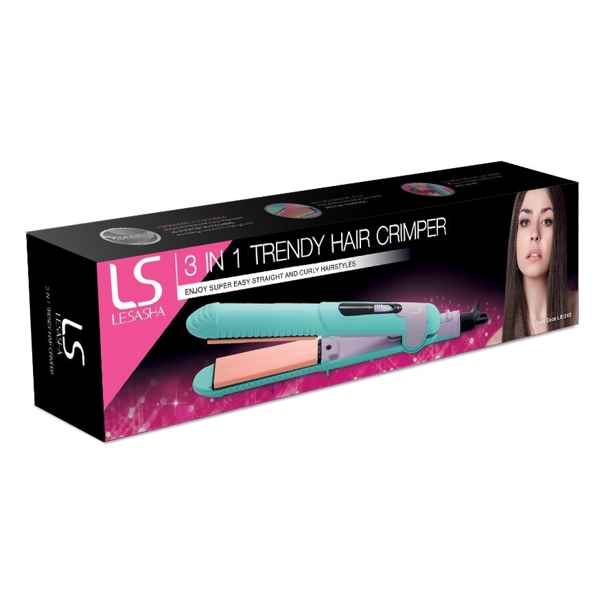 Le Sasha 3In1 Trendy Hair Crimper (LS1242) A good value 3IN1 hair crimper which comes with 3 changeable styling plate types for Straight Curly Wavy and Volume Hairstyles. Specifications 1. 30W 220-240V 2. Cord length 1.8 M. 3. Ceramic coated heat plates for stable heat smooth styling and long lasting result. 4. Curve Body Design for easily creating curl. 5. 3 Changeable Styling Plate Types for Straight Curly Wavy and Volme Hairstyles. How to use 1. This appliance must be used on dry hair 2. Plug the appliance into the clean and safe power outlet 3. Slide the power switch to turn the appliance on 4. Separate the hair into small section. 5. Start styling the hair