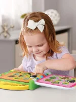 Join all the animals and explore their habitats and new vocabulary in the 100 Animals Book. Explore the colourful pages and touch each picture to hear the animals, their sounds and habitats along with exciting facts and sound effects. Immerse your child in bilingual play by sliding the language switch to hear the words, songs and instructions in French. Touch the pictures to hear fun animal facts in Fun Fact mode or press the light-up star button to hear three learning songs.