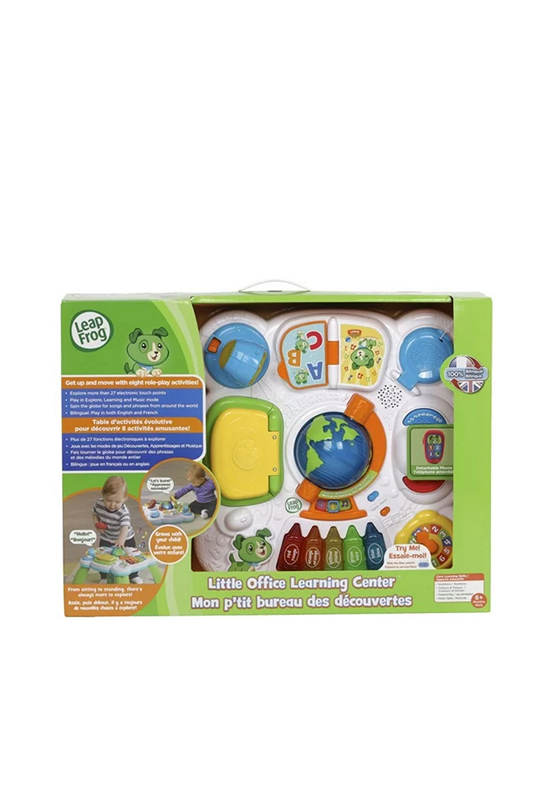 LEAPFROG Get to Work Learning and Playing on an Exciting First Desk.Work is fun with the eight role-play activities for little ones on the Little Office Learning Center™. This first desk includes a globe, laptop, phone, desk lamp and more so children can learn about greetings from around the world, shapes, animals, numbers and opposites. After a hard day of learning play, they can make their own music by pressing the crayon piano keys. The desk is also bilingual so kids can play in both English and Spanish. Whether their playing on the floor or standing, there’s so much to explore!