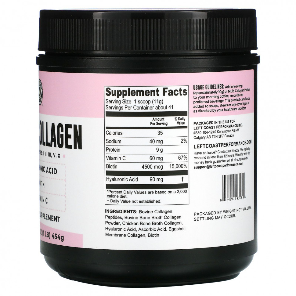 ?Коллаген типов I, II, III, V, X: Коллаген — самый распространенный белок в нашем организме. Он поддерживает крепкие ногти и волосы, здоровье суставов и кожу. Исследования показали, что с возрастом выработка коллагена может замедляться. Уникальный состав мультиколлагена от Left Coast Performance обеспечивает пять основных типов коллагена, помогая поддерживать крепкие волосы и ногти, здоровые суставы и молодую кожу.