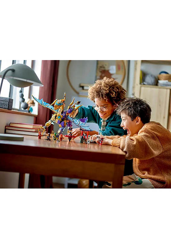 Delight boys and girls aged 9 and up with this LEGO® NINJAGO® Arc Dragon of Focus (71836) ninja toy that lets them role-play epic action scenes from season 3 of the NINJAGO Dragons Rising TV show. This building kit features a 2-headed dragon figure with a posable tail, legs, feet, head, neck, jaw and claws. Kids can activate a shooter in its chest and move its large foil wings back and forth using a lever on its back.