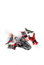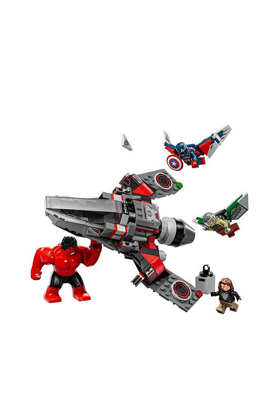 This fighter jet buildable toy includes an impressive cast of minifigures: Captain America and Falcon (both with opening wings), Red Hulk and Ruth Bat-Seraph. Featuring a large opening cockpit with room inside for a minifigure pilot, the jet is easy for kids to hold and fly around while they launch attacks using the 2 attached stud shooters A top section of the jet can be removed to reveal a hidden storage compartment in the rear with room for spare studs or mystery metals.
