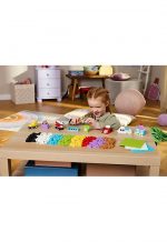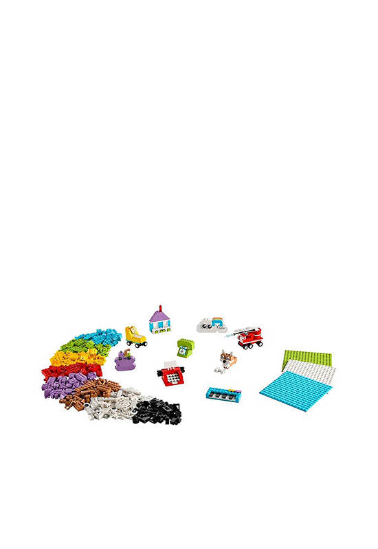 With 750 brightly colored bricks, 3 16×16 building plates, eye pieces, wheels, windows, and other special elements, this play-packed set puts building fun right into kids’ hands. A simple guide kick-starts the creativity by showing kids how they can build lots of cool models, including a house, a dog with a bone, a fire truck with a moving ladder, a piano keyboard, a telephone, a typewriter, grapes, clouds with a rainbow, and a roller skate.