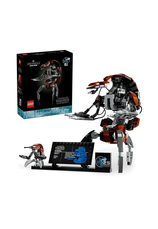 To complete a striking centerpiece, this creative building set also has a stand with an information plaque, a LEGO Star Wars 25th anniversary brick and space for the included small LEGO figure of a Droideka.