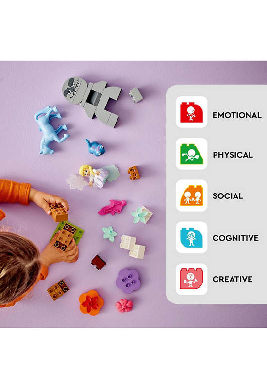Toddlers develop self-expression as they recreate scenes from the movie or invent their own adventures! This fantasy building toy has cool details to spark storytelling. Elsa’s snow crystal shines the way through the dark. Bruni’s flame element appears as the buildable toy Earth Giant approaches, but the characters become friends as they realize all creatures keep nature in balance. The Elsa mini-doll climbs onto the Nokk horse figure to be spirited away in a flurry of autumn leaves to her next adventure.