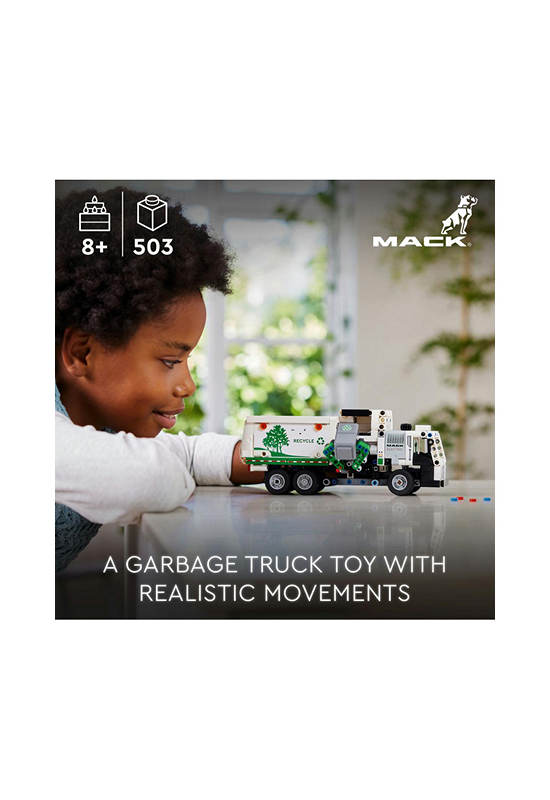 Truck toy for kids aged 8+ – The LEGO® Technic™ Mack® LR Electric Garbage Truck for boys and girls features a side loader to grab, lift and tip the garbage cans