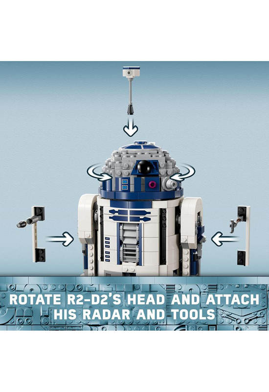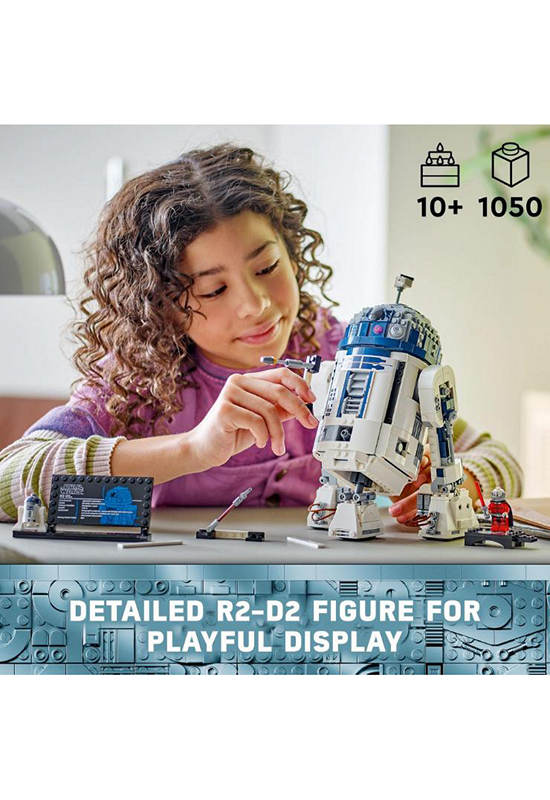 Let kids build their affection for the most lovable droid in the Star Wars™ galaxy with this LEGO® brick-built R2-D2 toy figure (75379). This playful buildable display toy model for boys and girls aged 10 and over is packed with authentic features so they can play out classic moments and original fantasy stories. Features include R2-D2’s 360-degree rotating head, an attachable third leg, attachable periscope and attachable tools.