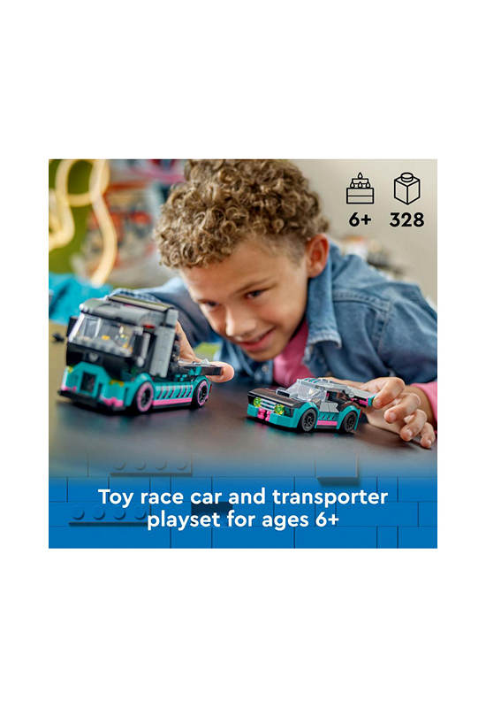 Toy car transporter – Fans of race cars and trucks can enjoy hours of play with this LEGO® City Race Car and Car Carrier Truck building set for ages 6 and up