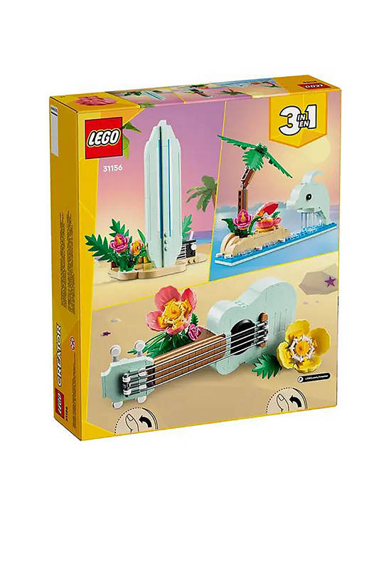 Kids can build, play with and display 3 beach-themed models in the LEGO® Creator Tropical Ukulele (31156) 3in1 playset. A great gift idea for girls and boys aged 8+, it features a ukulele on a beach scene stand with 2 colorful flowers and grass. The instrument toy can be detached from the stand and has 4 plastic strings that vibrate when strummed.