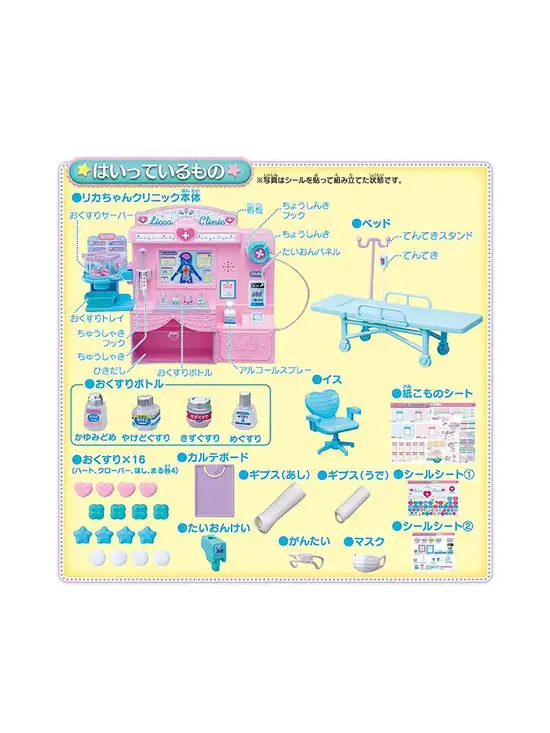 Role-playing toys from the brand LICCA. It’s a role-playing toy that lets your child play the role of a doctor. Come to help strengthen the development of your baby, such as 1. Measure body temperature and disinfect with alcohol spray 2. Lay the patient on the bed and diagnose with a stethoscope 3. Apply an accessory according to the diagnosis! A set that allows you to enjoy a series of realistic doctor plays. When you put a stethoscope on it, the LED on the diagnosis screen and Licca’s voice tell you the diagnosis result. A lot of small items such as medicine servers, syringes, casts, masks, eye patches, and drips!