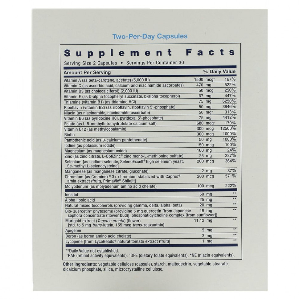 Капсулы для приема дважды в день. Эта формула обеспечивает организму широкий спектр необходимых витаминов, микроэлементов и других питательных веществ. Многие мультивитамины содержат только среднюю суточную дозу витаминов и микроэлементов. Наша формула для приема дважды в день превосходит Centrum® Silver® для взрослых старше 50 лет по 10 параметрам, поскольку содержит больше витаминов B1, B3, B6, B12, C, D и E, биотина, селена и цинка.