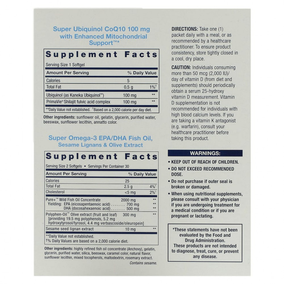 Каждый пакетик с усовершенствованным комплексом питательных веществ содержит 2 капсулы для приема два раза в день, 2 мягкие таблетки Super омега-3 ЭПК и ДГК, 1 мягкую таблетку препарата Health Booster для приема 1 раз в день, 1 мягкую таблетку убихинола Super Ubiquinol с коэнзимом Q10 и Enhanced Mitochondrial Support™ (100 мг) и 1 капсулу экстракта куркумы Super Bio-Curcumin®, обеспечивая питательные вещества, необходимые для здоровья и долголетия, в удобной одноразовой упаковке.