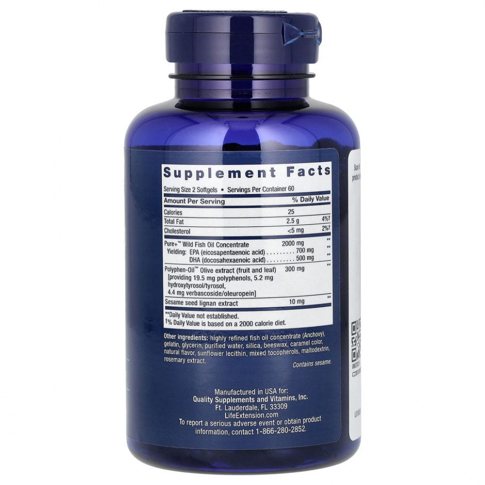 Средиземноморская диета,в которой основными продуктами питания являются оливковое масло первого отжима и морепродукты, ассоциируется у людей со здоровьем сердца и увеличением продолжительности жизни. Эта здоровая диета вдохновила нас на создание продукта, сочетающего в себе чистый высококонцентрированный рыбий жир с кунжутными лигнанами и уникальными полифенолами, полученными из экстракта оливы.
