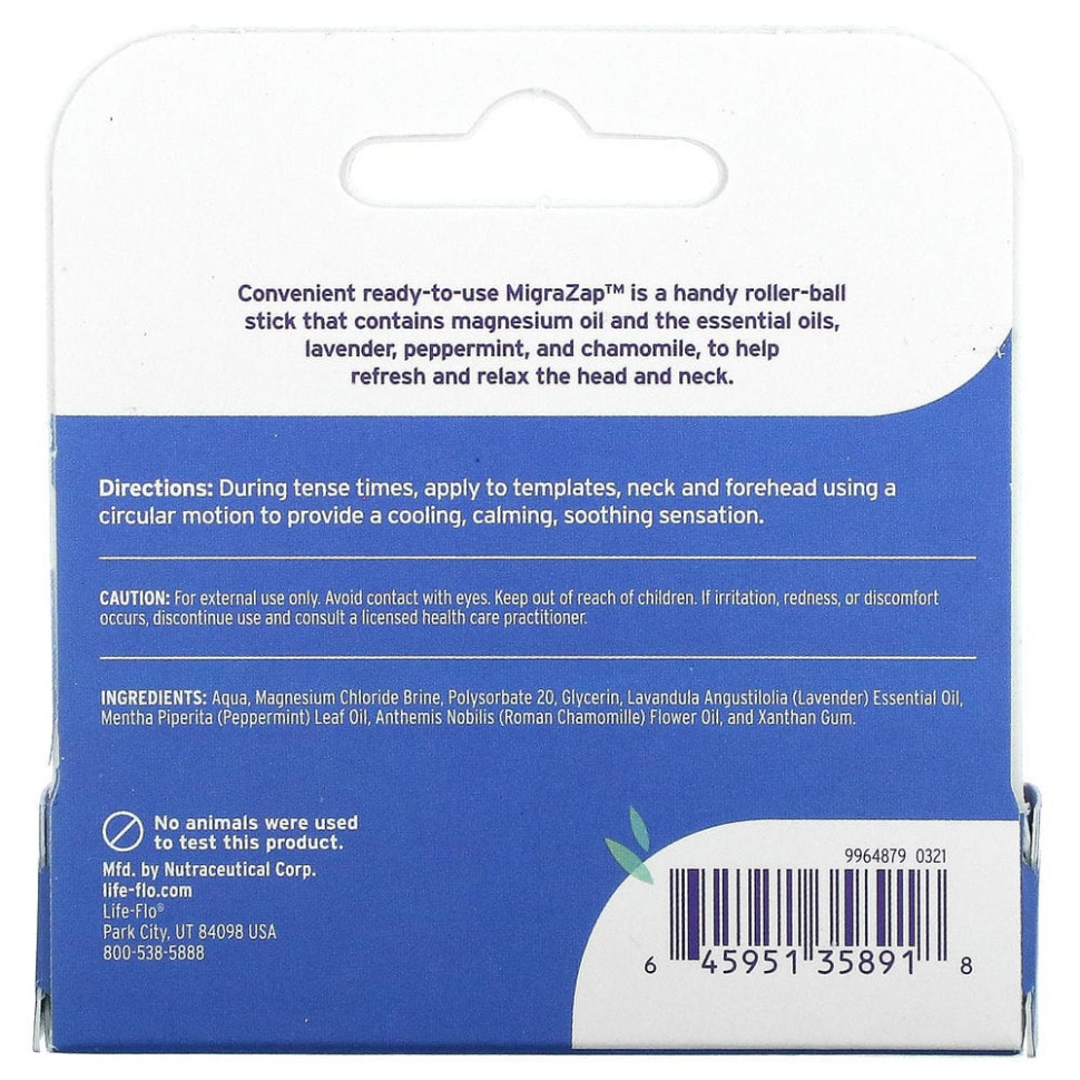 Описание. MigraZap™ — удобный, готовый к использованию шариковый аппликатор, который можно брать с собой. Содержит магниевое масло и эфирные масла лаванды, мяты перечной и ромашки, которые помогают освежить и расслабить голову и шею.