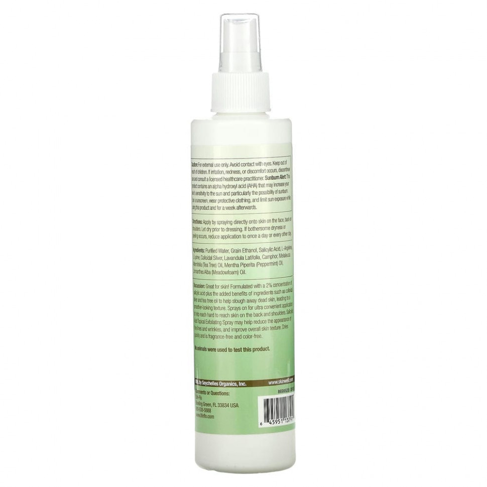 Описание: отлично подходит для кожи! Содержит 2% салициловую кислоту с добавочными полезными компонентами, включая коллоидное серебро и масло чайного дерева для отшелушивания мертвой кожи и разглаживания текстуры. Спрей очень удобно распылять, в том числе на труднодоступные участки на плечах и спине. Местный отшелушивающий спрей с салициловой кислотой сокращает заметность тонких морщин и улучшает общую текстуру кожи. Он быстро высыхает и не имеет цвета и запаха.