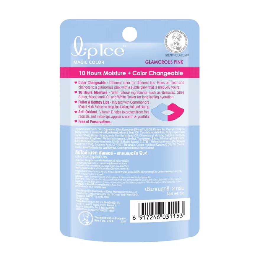 LipIce Magic Color Glamorous Pink Nourishing lips with pH color chagable and gilter double-layer lip balm, mind mint favor Argan Oil, Shea Butter and Vitamin E — brighten dull lips and 10 hr. long lasting hydration lips. Aloe, Beeswax, Macadamia nut oil and Meadowfoam Seed Oil — restore dry lip and smoothen lips Apply on the lip everyday. LipIce Magic Color Glamorous Pink Nourishing lips with pH color chagable and gilter double-layer lip balm, mind mint favor Argan Oil, Shea Butter and Vitamin E brighten dull lips and 10 hr. long lasting hydration lips and restore dry lip and smoothen lips.
