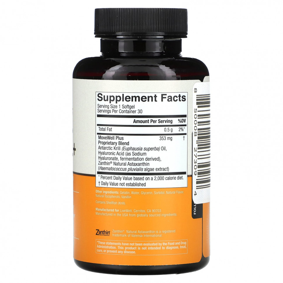 | Запатентованная смесь MoveWell Plus Масло антарктического криля (Euphausia superba), гиалуроновая кислота (в виде гиалуроната натрия, полученная путем ферментации), экстракт водорослей Zanthin® Natural Astaxanthin Haematococcus pluvialis) |