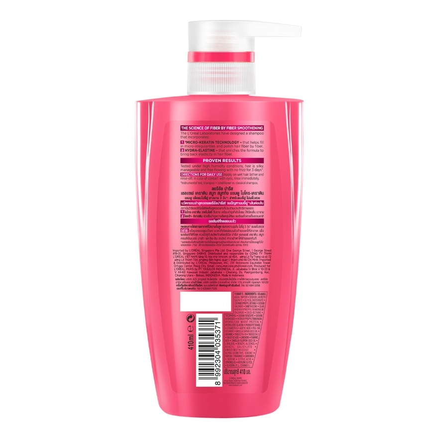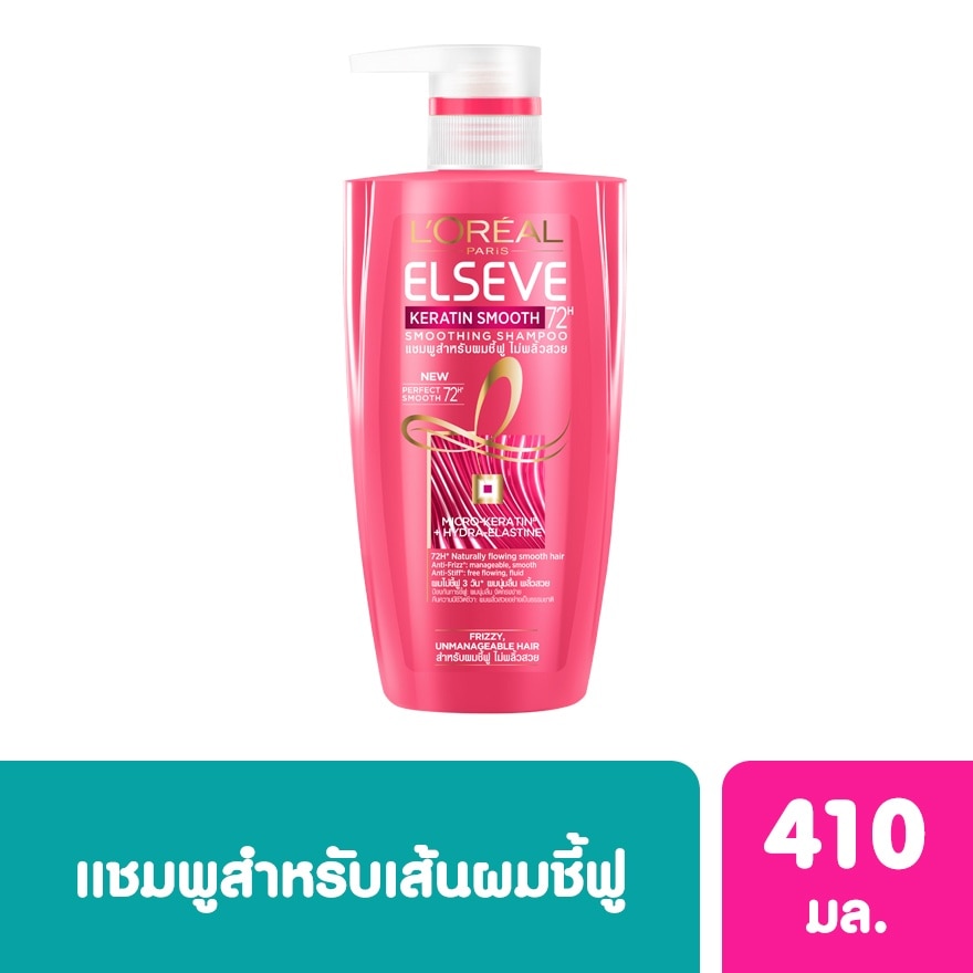 L'Oreal Paris Elseve Shampoo Keratin Smooth 72H Perfecting Micro-keratin technology helps fill in irregularities and polish hair fiber by fiber. Camelia extract helps hydrating and softening hair. Why you'll love it. Gives hair salon smoothness for 72 hours. Hair feels smooth, soft and bouncy and manageable with no frizz for 3 days. Apply to wet hair and massage gently into thick lather. Rinse properly and thoroughly. Recommend to use with other L'oreal product. L'oreal Paris Elseve Keratin Smooth 72h Perfacting Shampoo, L'oreal Paris Elseve Keratin Smooth 72h Perfacting Conditioner, L'oreal Paris Keratin Smooth 1 Minutes Perfecting Mask and L'oreal Paris Elseve Extraordinary Oil All Hair Types. The packaging of this product is made with 56% recycled plastic.