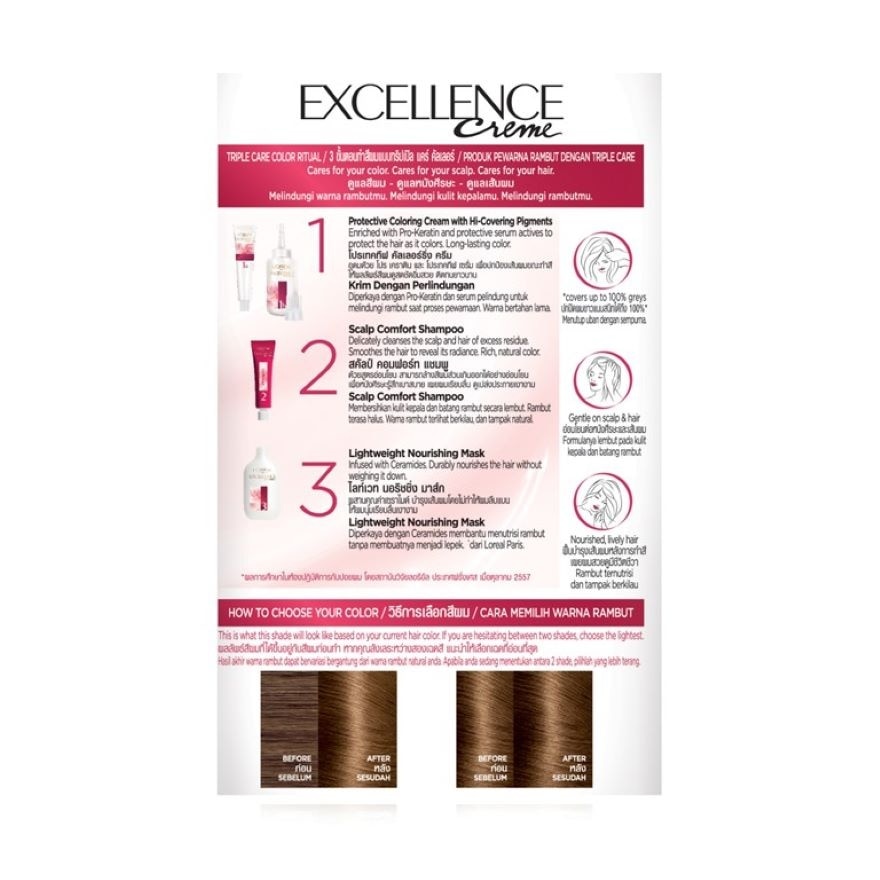 Triple Care Colour Ritual Hair Dye by Excellence Cares for your colour. Cares for your scalp. Cares for your hair. 1. Colouring Cream Enriched with Pro-Keratin. Protects the hair as it colours. Long-lasting, multi-tonal colour. 2. Gentle Post-Colour Shampoo Delicately cleanses the scalp and hair by gently rinsing away excess residue. Smooths the hair to reveal its radiance. Natural, multi-tonal colour result. Formulated specifically to be used right after colouring your hair 3. Nouriching Mask Infused with conditioning ingredients. Intensively nourishes the hair without weighing it down. Promote paper packaging made with paper from responsibly managed forests, or with recycled content. The paper used in this packaging is certified by FSC.