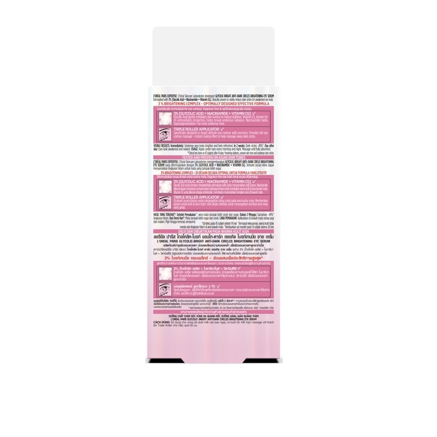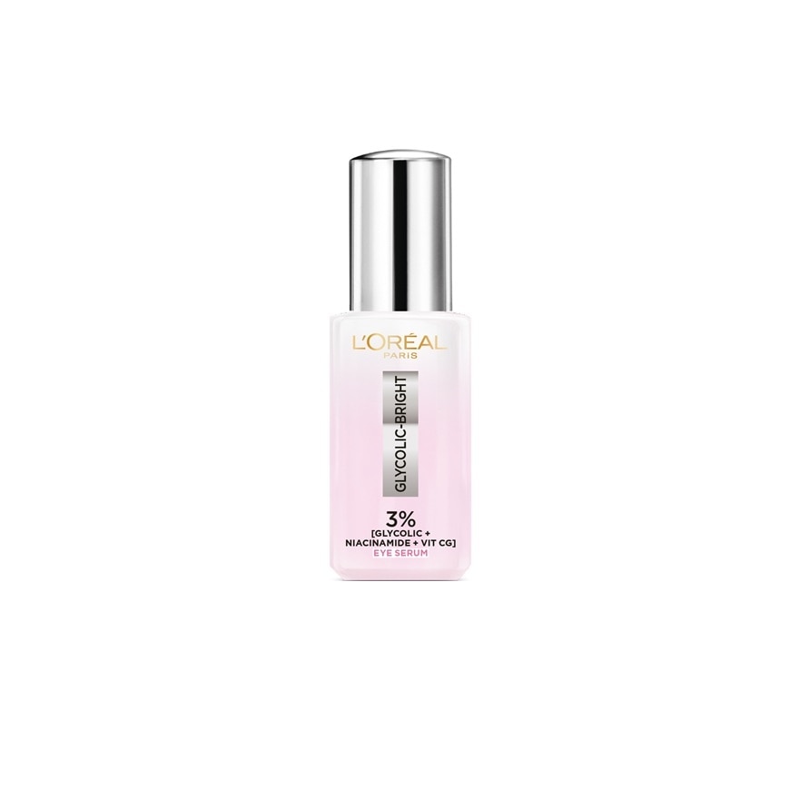 L'OREAL PARIS GLYCOLIC-BRIGHT DARK CIRCLE EYE SERUM L'OREAL PARIS EXPERTISE L'OREAL Skincare Laboratories developed GLYCOLIC-BRIGHT DARK CIRCLE EYE SERUM formulated with 3 [Glycolic Acid + Vitamin CG + Niacinamide].
