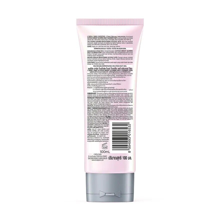 LOreal Paris Glycolic-Bright Glowing Daily Cleanser Foam Loreal Paris Laboratories developed GLYCOLIC-BRIGHT GLOWING DAILY CLEANSER FOAM to gently exfoliate and deeply cleanse skin With dense creamy foam thoroughly clears impurities and make-up THE SCIENCE BEHIND BRIGHTENING GLYCOLIC ACID With the smallest molecular weight amongst all brightening Alpha Hydroxy Acids it penetrates deeply and effectively accelerates skins own renewal. Apply on a wet face and rinse Avoid eye contour. Alpha Hydroxy Acids it penetrates deeply and effectively accelerates skins own renewal.