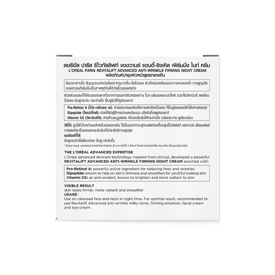 L'OREAL PARIS REVITALIFT ADVANCED ANTI-WRINKLE FIRMING NIGHT CREAM L'Oreal advanced skincare technology inspired from clinical, developed a powerful REVITALIFT cream reduces wrinkles in 8 areas with firm skin, enriched with Pro-retinol, Dipeptide and Vitamin CG for infinite youthful skin. Visible result Immediately Skin looks firmer, more radiant and smoother Within 4 weeks, wrinkles in 8 areas are reduced with firm skin and more radiance. 98 of users feel skin look younger1 Usage Use on cleansed face and neck. For optimal result, recommended to use Revitalift Advanced anti-wrinkle product range -8 areas is 1. Forehead 2. Gabellar Fold 3. Eye contour 4. Crow's feet 5. Nasolabial Folds 6. Marionette Folds 7. Neck Area 8. Global appearance of fine lines -1Consumer use test conducted on 65 women Clinical test.