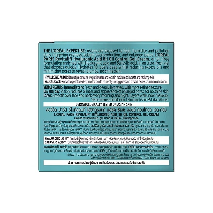 L'OREAL PARIS REVITALIFT HYALURONIC ACID 8H OIL CONTROL GEL-CREAM, an oil-free formulation enriched with Hyaluronic acid and Salicylic acid, in an ultra-fresh and lightweight gel that absorbs quickly.
