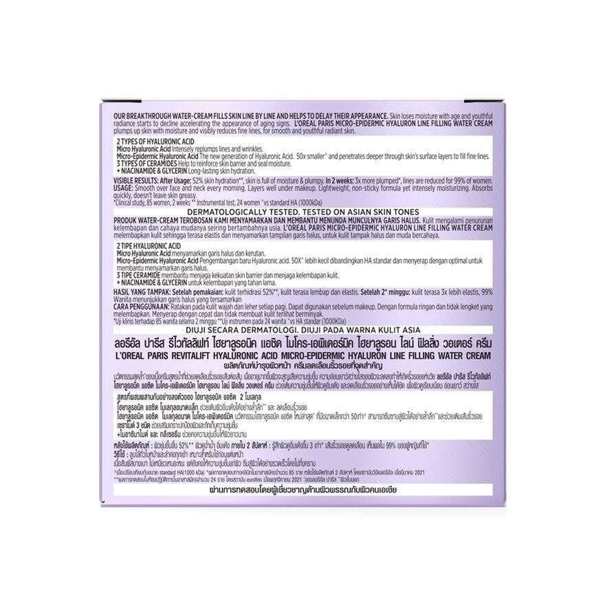 L'Oreal Paris Revitalift Hyaluronic Acid Micro-Epidermic Hyaluron Line Filling Water Cream THE L'OREAL EXPERTISE Skin loses moisture with age-and youthful radiance starts to decline, accelerating the appearance of aging signs. Dullness, loss of plumpiness and fine lines become even more visible. L'OREAL PARIS HYALURONIC ACID PLUMPING CREAM DAY, formulated with the highest concentration of Hyaluronic Acid, plumps up skin with moisture and visibly reduces fine lines, for smooth and youthful radiant skin. within L'Oreal Paris THE SCIENCE BEHIND HYALURONIC ACID Naturally found in skin, Hyaluronic Acid can hold up to 1000 times its weight in moisture. With age, hyaluronic acid levels deplete exponentially and drop significantly after 30 years old. The patented Micro HA active penetrates deeply to intensely hydrate skin and plump up from within.