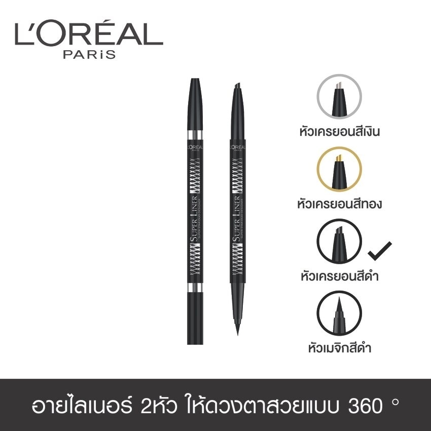 First time ever that L’oreal Makeup Designer Paris creates such a brilliant eyeliner for all cosmetics fanatics by introducing its Super Liner Super Star Duo Designer the first duo-ended eyeliner, a fabulous multi-tasker for every eye makeup look. This all-in-one liner is designed into a duo-head liner with a magic liner on one end and a pencil liner on the other, powered with 24-hour smudge-proof and waterproof formula. Why you’ll love it : 24-hour smudge-proof and waterproof formula. Its soft and creamy textures provide a smooth and delicate finish for all-day comfort. Functional and versatile: a dual ended eyeliner of both a pencil liner and a gel liner. Convenient on-the-go: equipped with a build-in sharpener. Formulated with a highly concentrated black pigment enabling you to create the perfect Superstar looking all at once. Safe for sensitive eyes and Ophthalmologist-tested. Contact lens safe.