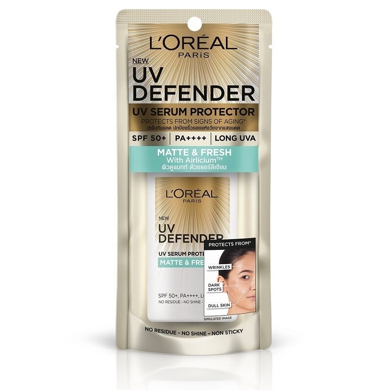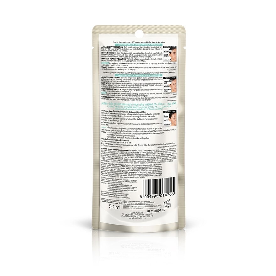 L’oreal Paris UV Defender Matte & Fresh SPF50+ PA++++ Long UVA ADVANCED UV PROTECTION Daily broad-spectrum filtering system to provide a very high SPF 50+ and long UVA protection and protects from skin aging signs induced by UV dark spots, dullness and wrinkles. MATTE & FRESH Oil-free. This lightweight, quick-absorbing formula is enriched with mattifying. AirliciumTM for an anti-shine effect. Leaves a dry matte finish on skin even in hot and humid climates. Tested up to 45C and 80% relative humidity. PROTECTS AGAINST POLLUTION With anti-adhesion properties, the formula helps to protect skin from adherence of pollution particles, even PM 2.5. RESULTS Immediately, skin is moisturized, refreshed and protected from UV rays and photoaging. Day after day, skin looks more even and smoother.