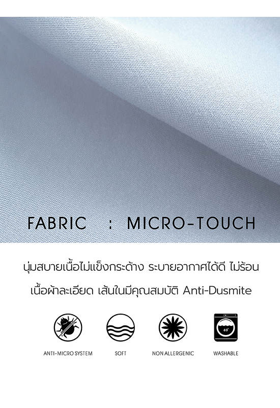 Micro Touch duvet is a fabric that has a smooth surface. Gives a soft and comfortable feeling, the fabric is not stiff. Good ventilation, not hot, fine fabric, Micro Touch fibers, thread count 400 per 10 sq. cm., seams and has Anti-Dust mite properties, does not cause allergic reactions, bright colors, does not fade, does not flake. Fully woven, seamless Beautiful modern design, Modern style helps make the bedroom beautiful.