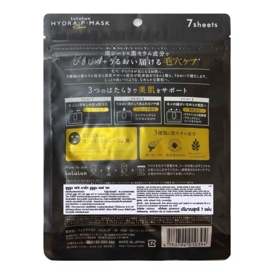 Lululun Face Mask Lululun Hydra F 1K from Japan With 3 types of premium black ingredients, Mother of pearl extract from Okinawa nourishes the skin and pores to look firm. NIACINAMIDE add moisture to make the glow skin. NIGELLA SATIVA SEED OIL smooth the skin surface and fill it with moisture. Black mask sheet made from Jotun charcoal Helps reduce rough skin and remove dead skin cells by gently scrubbing the mask on the face after removing the mask. Clean then wipe dry, put the mask on your face. Leave on for 10-15 minutes and then pull the mask off using a mask to wipe the face or neck Essence to the skin.