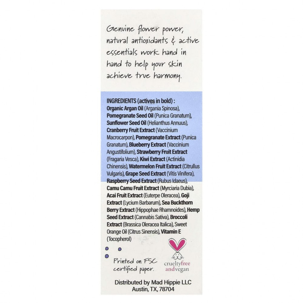 Настоящая сила цветов, натуральные антиоксиданты и активные необходимые вещества совместно сокращают признаки старения. Не имея в составе вредных химикатов, парабенов, синтетических красителей и ароматизаторов, продукты Mad Hippie помогают вашей коже достичь полной гармонии.
