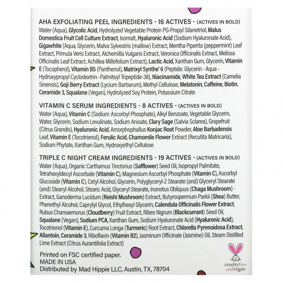 Ночной крем Triple C — 19 активных ингредиентов: (Активные элементы выделены жирным шрифтом) Вода, органический сафлор красильный (сафлор) масло семян Изопропил пальмитат тетрагексилдецил аскорбат (витамин С), аскорбилфосфат магния (витамин С), аскорбил глюкозид (витамин C), цетиловый спирт, глицерин, полиглицерил-2 стеарат (и) глицерил стеарат (и) стеариловый спирт, стеариновая кислота, глицерил стеарат, инонотус косой (гриб чага) извлекать, Ganoderma lucidum (гриб рейши) извлекать, Butyrospermum parkii масло ши, фенетиловый спирт, каприлилгликоль, этилгексилглицерин, экстракт цветков календулы лекарственной, Rubus chamaemorus (морошка) (фруктовый экстракт), Ribes nigrum (черная смородина) масло семян сквалан (веганский), натрия pca, ксантановая камедь, гиалуронат натрия (гиалуроновая кислота) (гиалуроновая кислота), токотриенол (витамин E), Curcuma longa (куркума) membranaceus), экстракт хлореллы (Chlorella pyrenoidosa), аллантоин, керамид 3, рибофлавин (витамин B2), масло жасмина (Jasminum officinale), экстракт лайма паровой дистилляции (Citrus aurantifolia).