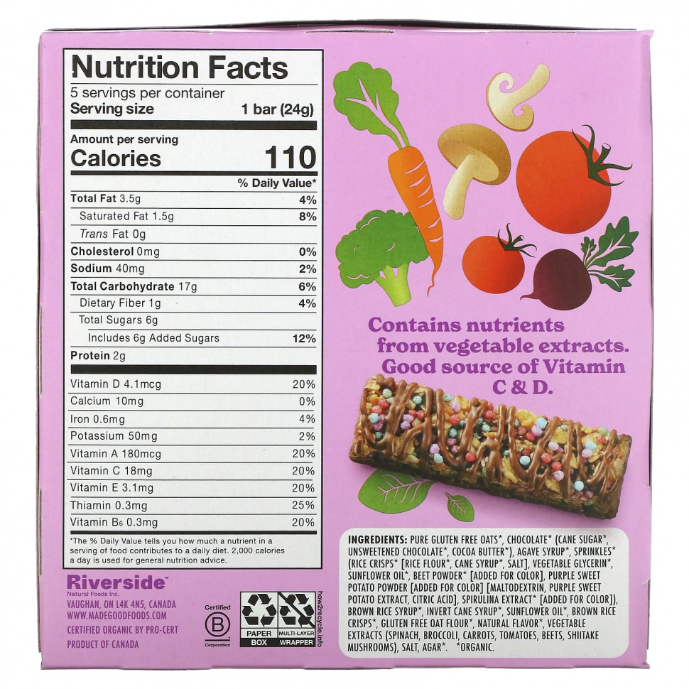 Чистый овес без глютена *, шоколад * (тростниковый сахар * несладкий шоколад *, какао-масло*), сироп агавы *, посыпка (рисовые чипсы * [рисовая мука *, тростниковый сироп *, соль), растительный глицерин *, подсолнечное масло *, свекольный порошок * [добавлен для цвета], порошок из фиолетового батата [добавлен для окрашивания] [мальтодекстрин, экстракт фиолетового батата, лимонная кислота], экстракт спирулины * [добавлен для цвета]), сироп из коричневого риса *, тростниковый сироп *, подсолнечное масло *, чипсы из коричневого риса *, безглютеновая овсяная мука *, натуральный ароматизатор *, растительные экстракты (шпинат, брокколи, морковь, томат, свекла, грибы шиитаке), соль, агар *.