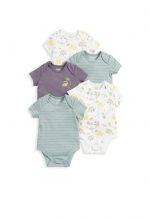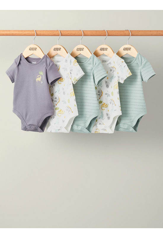 Handy five-pack of short sleeved boys’ bodysuits from MAMAS & PAPAS. Featuring soft and subtle dinosaur prints, stripe prints and plain with a character. Handy popper fastening for quick and easy nappy changes. Crafted from super soft cotton that’s gentle on baby’s skin.