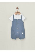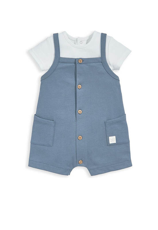 Bodysuit and dungarees set from MAMAS&PAPAS. Short-sleeved bodysuit in 100% cotton, with cream and petrol blue stripes. Shoulder opening with concealed poppers for easy dressing. Popper opening at crotch. Dungarees with straps, finished with mock wood buttons. Large side pockets. Woven Hello World badge.