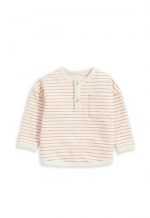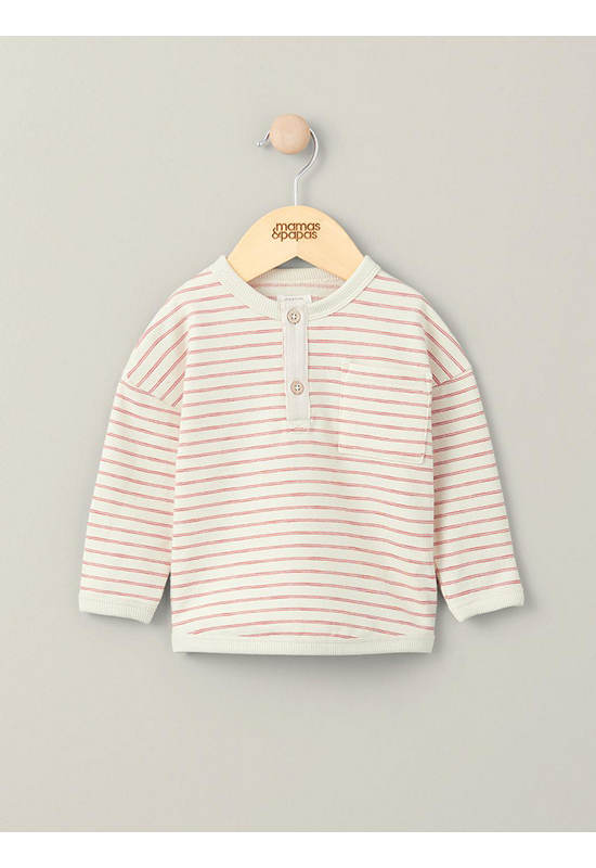 Boys’ loopback long-sleeve top from MAMAS & PAPAS. Lightweight fabric. Striped with contrast placket. Mock wooden button opening. Pairs perfectly with our matching striped joggers.