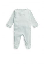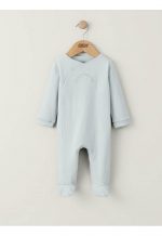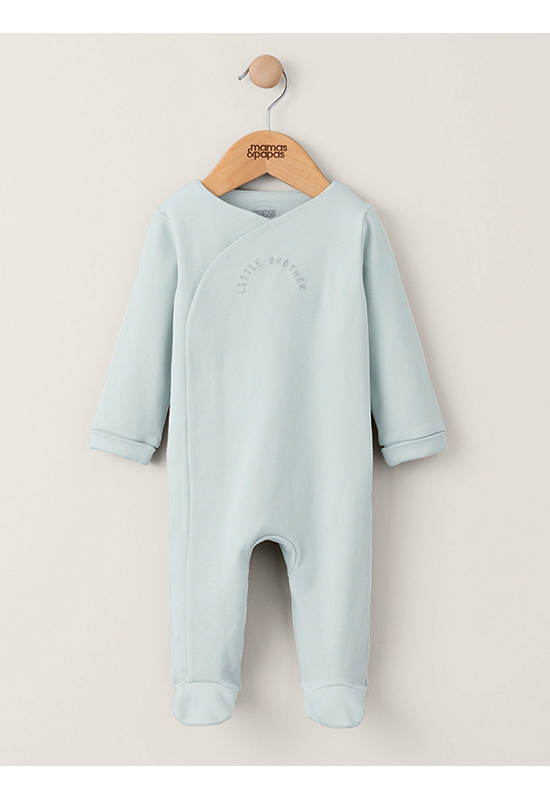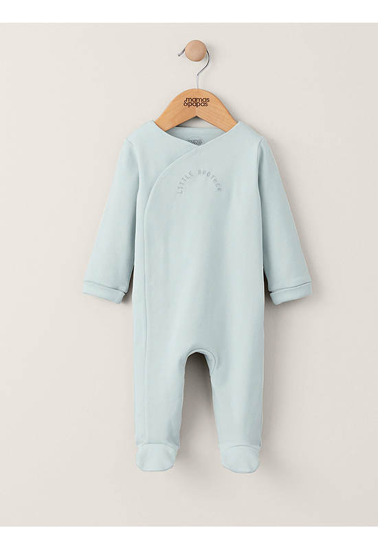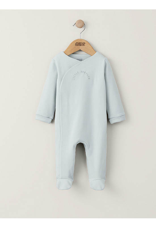 Long sleeved all in one sleepsuit with integrated feet — ‘Little Brother’ embroidery. Wrap front design — popper fastening.