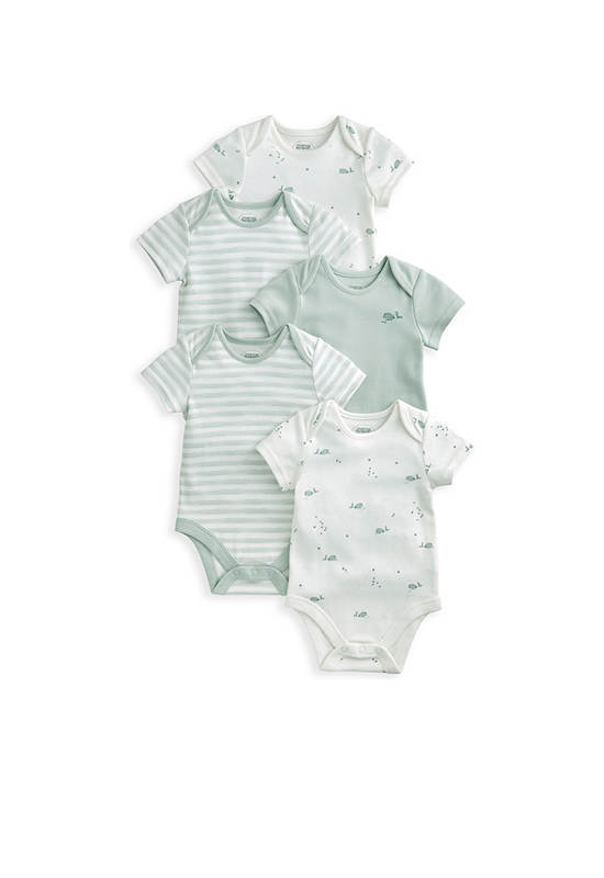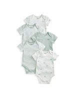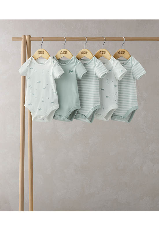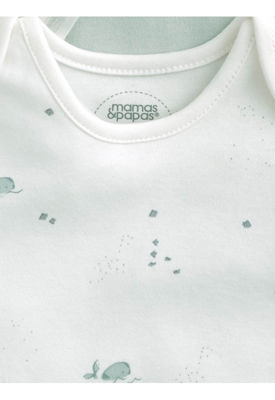 Handy 5-pack printed short-sleeved bodysuits with envelope neckline and popper fastening at crotch. In various whale-themed designs, including embroidery