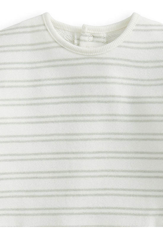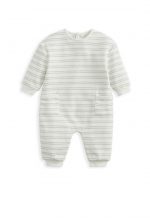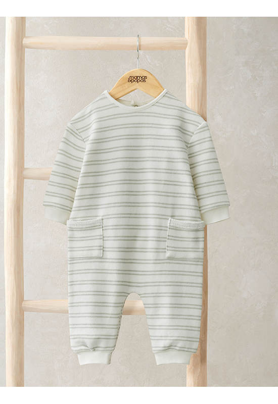 This striped romper features ribbed trim at the neck, cuffs, and hem, self pockets, and convenient popper openings for easy dressing.