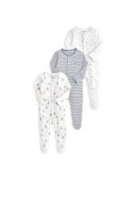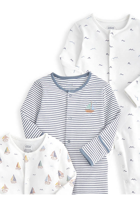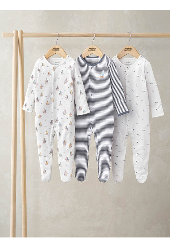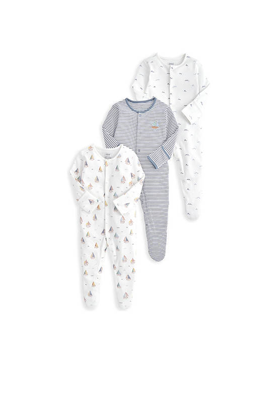 A 3-pack of long-sleeved, nautical print sleepsuits with front and gusset popper openings, integral scratch mitts and cosy cut-and-sew feet.
