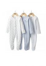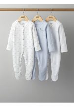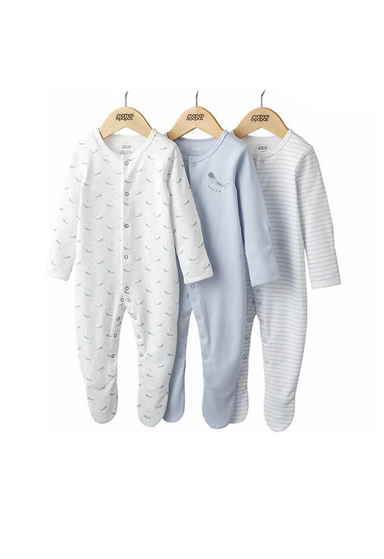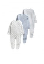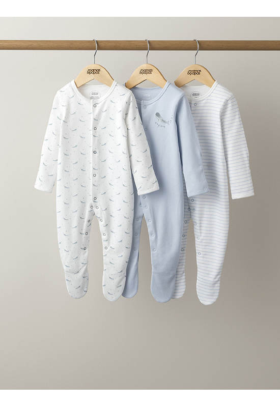 Handy pack of 3 long-sleeved all-in-one sleepsuits — in three complementary designs, an adorable whale print, stripe print and plain with whale image. Popper fastening allows for easy dressing and quick nappy changes. Integrated scratch mitts in sizes up to 9-12 Months so separate scratch mittens not needed. Anti-slip soles from size 12-18 Months ideal to stop little walkers from slipping as they find their feet.