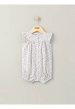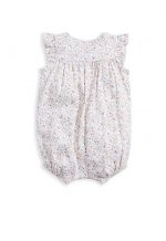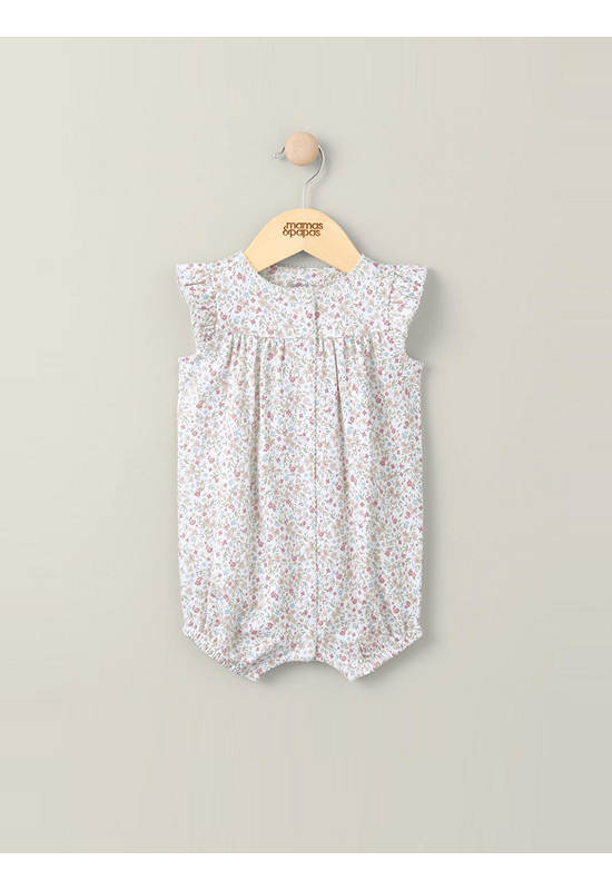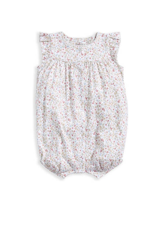 Sleeveless shortie romper from MAMAS&PAPAS. Made from ultrasoft cotton with ditsy floral print and dusky pink trim. A popper fastening at centre front and additional concealed popper fastening at crotch means dressing and nappy changes are easier.