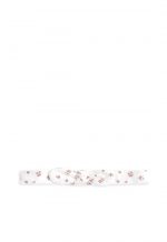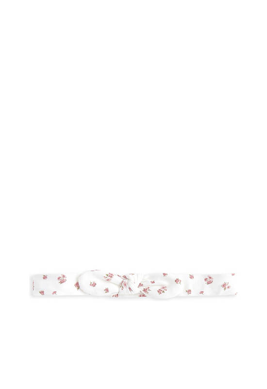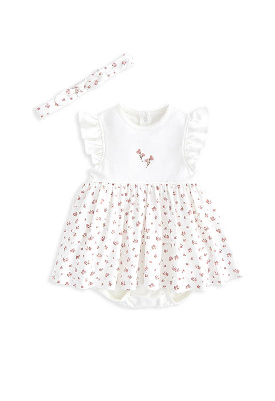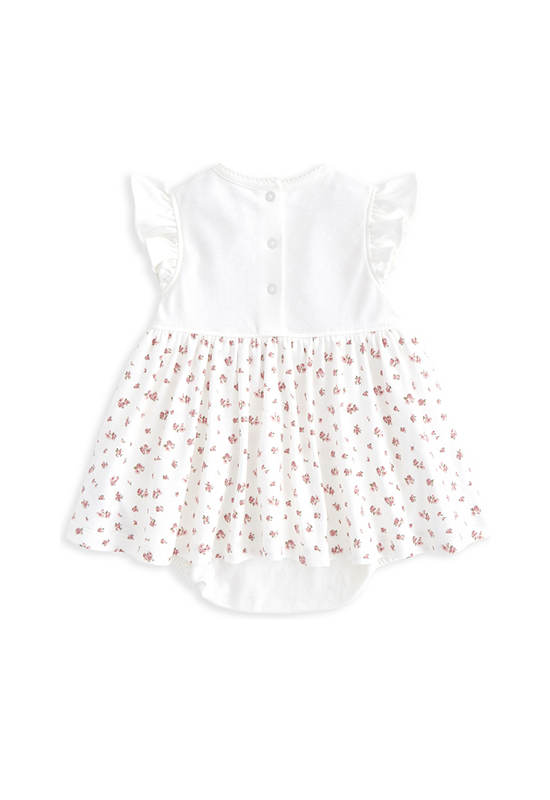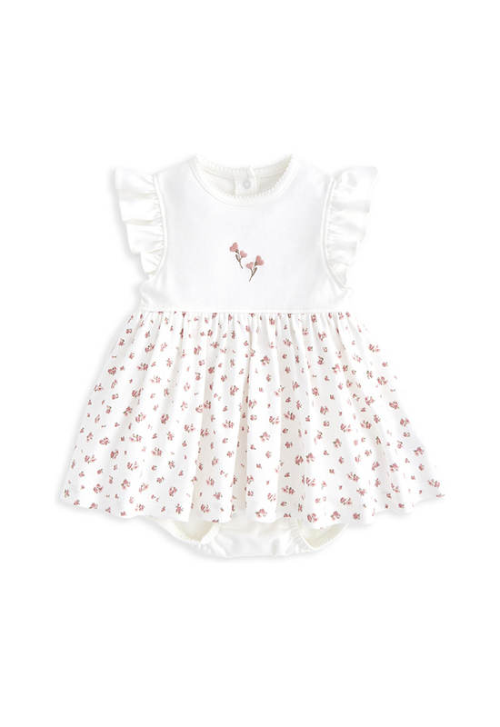 Dress with embroidered flower on front yoke, frill sleeve, popper opening at back & gusset. Laid on Gathered skirt in ditsy rose print.