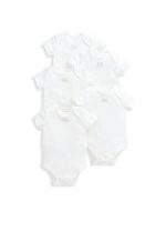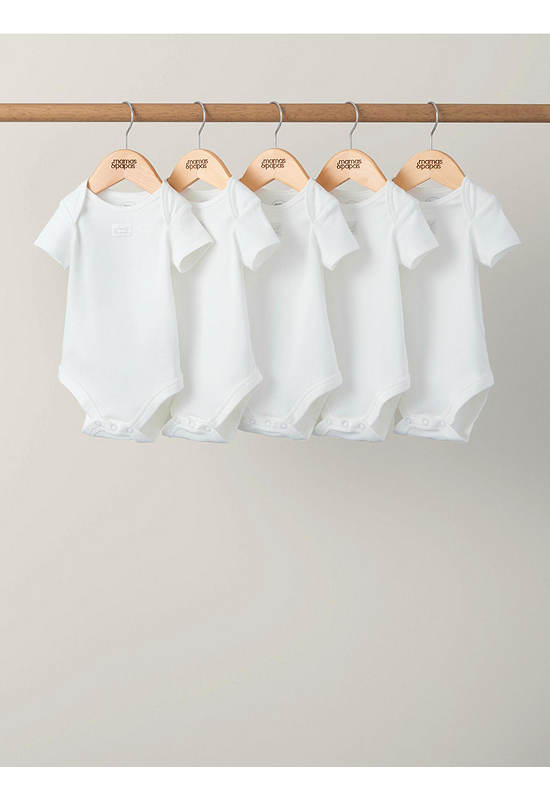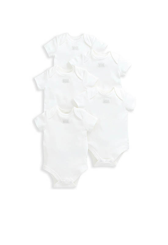 Handy 5-pack of pure white short-sleeved bodysuits from MAMAS & PAPAS in supersoft organic white cotton that’s soft and gentle on newborn skin. Popper fastening for easy changes and finished with Welcome to the World woven badge detail.